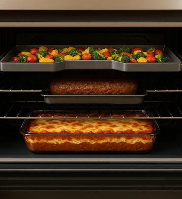 You can cook your vegetables or biscuits without disturbing the casserole and the meatloaf that are cooking in the two racks below.