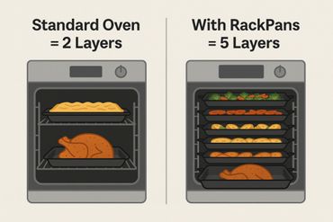 The RackPan becomes a third layer of cooking in your oven. You can still utilize both the standard oven racks